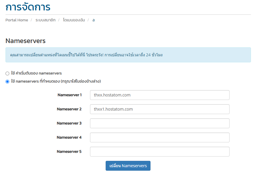 เมื่อเราเข้ามาที่โดเมนของฉันเรียบร้อยแล้ว ให้เราไปยังชื่อโดเมนจากนั้นคลิกให้เป็น dropdown และคลิก > จัดการ Nameserver ต่อมาเลือกใช้ Nameserver ที่กำหนดเอง วางชื่อ Nameserver ของโฮสเรา โดยใส่ Nameserver 1 และ Nameserver 2 สำรองไว้เรียบร้อยแล้ว > คลิกเปลี่ยน Nameserver ได้เลย
